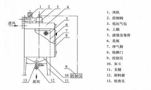 含塵氣體由上部進風口斜插進入中箱體,通過慣性碰撞,較粗顆粒粉塵在自重力作用下,直接沉落至灰斗中,并經卸灰機構將粉塵從出灰口排出。另一部分較細粉塵在風機的作用下,吸附在濾袋外表面,潔凈氣體穿過濾袋進入中箱體凈氣箱,并流經矩形誘導管匯集在出風箱內從風機出口排出。隨著過濾工況的不斷進行,除塵器阻力應維持在限定的范圍(<12KPa)內,故必須進行清灰來達到抖落粉塵,降低設備阻力的目的。該系統除塵器是采用脈沖控制儀定時控制低壓脈沖閥進行噴吹清灰的方法,使濾袋在其噴吹及誘導氣量的作用下,造成布袋瞬間鼓脹,抖落粉塵。