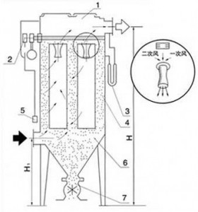 含塵氣體由除塵器進風口進入中,下箱體,通過濾袋進入上箱體的過程中由于濾袋的各種效應作用。將粉塵氣體分離開,粉塵被吸咐在濾袋上,而氣體穿過濾袋由文氏管進入上箱體,從出風口排出。含塵氣體通過濾袋凈化的過程中,隨著時間增加,而積在濾袋上的粉塵越來越多,因而使濾袋的阻力逐漸增加,通過濾袋子的氣體量逐漸減少,為了使除塵器能正常工作所以要把阻力控制在限定范圍內(一般為120-150毫米水柱)。這樣當阻力升到限定范圍的時候,由控制儀就要發出指令按順序觸發各控制閥,開啟脈沖閥。氣包內的壓縮空氣由噴吹管各孔經文氏管噴射到各對應的濾袋內,濾袋在氣流瞬間反向作用下急劇膨脹,使積在濾袋表面的粉塵脫落,濾袋得再生。被清掉的粉塵落入灰斗經排灰系統排出機體,由于積在濾袋上的粉塵定期清除,被凈化的氣體正常通過,保證除塵器正常工作。