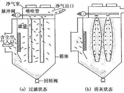 在清灰過程中,每次噴吹時間稱脈沖寬度,一般僅0.1-0.2秒,全部濾袋完成一個清灰循環的時間為脈沖周期。