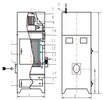含塵氣體進入箱體,由扁布袋過濾器進行過濾,粉塵被阻留在除塵布袋外表面,已凈化的氣體通過濾袋進入風機,由風機吸入直接排入室內(也可接管排至室外)。