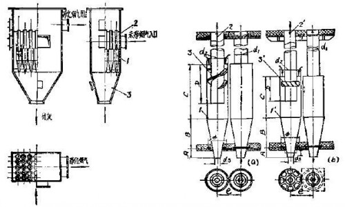 該除塵器利用了旋風筒內速度場分布的高峰對煙氣上升的作用,設置了上升筒和二次分離室以及中間排氣管。煙氣由入口以設計速度旋流進入筒體,煙塵受離心作用而分離,由上而下分離的粉塵沿筒體沉降到灰槽;煙氣以旋流的高峰速度沿0.6左右筒徑上升,含微塵濃度較高的部分煙氣沿上升筒壁高速旋流進二次分離室,再經旁路風道回到錐體,二次被分離的粉塵降到錐底匯同一次分離的粉塵進入灰槽。二次被分離后的煙氣從中間排氣管由出口排出。由于在上升筒的上升旋流速度較主筒體內要高的多,故微塵能有效的進行二次分離。大大提高了整體除塵效率。